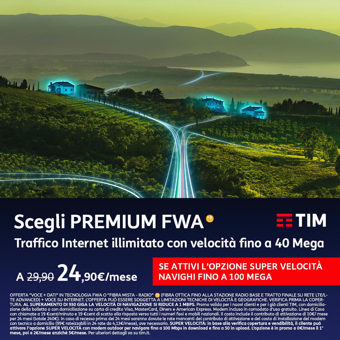 Scegli PREMIUM FWA: Internet veloce fino a 40 Mega con traffico illimitato e chiamate a consumo verso tutti! Naviga e studia da casa alla massima velocità.Tutto a 24,90€ al mese con Modem FWA incluso.In più, se attivi l’opzione Super velocità, puoi navigare fino a 100 Mega!